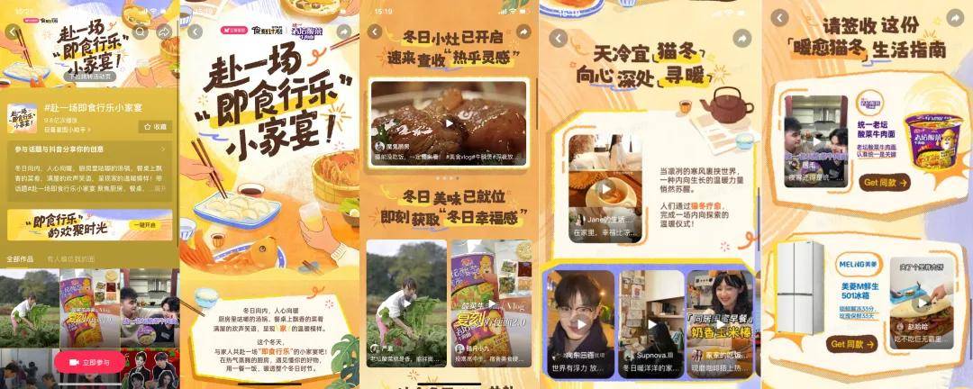 主话题#赴一场即食行乐小家宴 奠定了温暖治愈的整体基调,同时支持联动各品牌子话题,精准承接不同品类品牌的流量需求,有效激发用户分享欲。从主话题页跳转到活动H5主会场,一场沉浸式的冬日互动之旅随即开启。H5以“暖愈猫冬生活指南”为线索,在这里,用户既能浏览达人们在猫冬疗愈中的宅家美学,也能获取冬日暖食的时令食谱灵感,更能在烟火家宴的合集里感受团聚的温情,全方位沉浸在暖冬氛围之中。